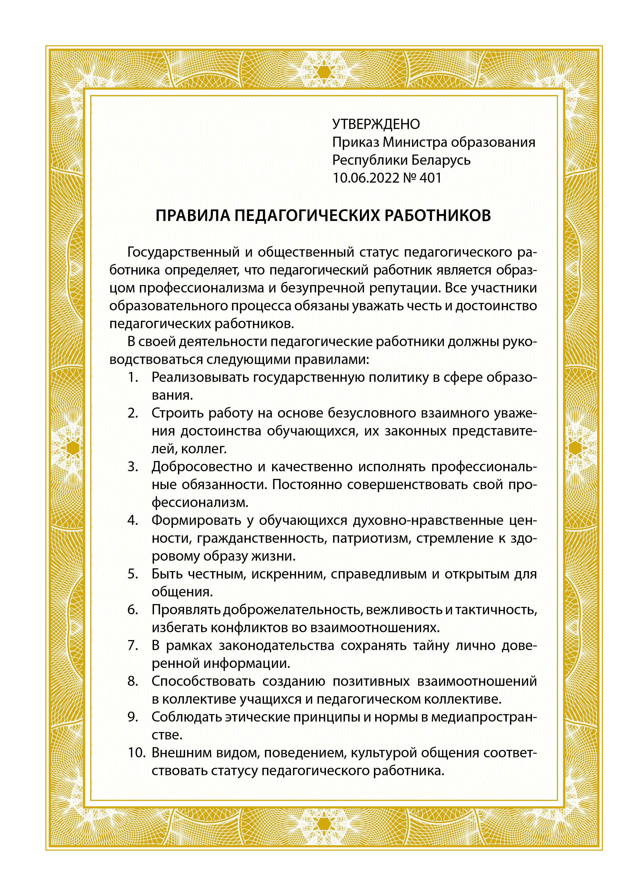 В соответствии с Приказом Министерства образования Республики Беларусь «Об утверждении Правил педагогических работников», в целях повышения престижа и статуса педагогической профессии и повышения эффективности взаимодействия участников образовательного процесса утверждены Правила.